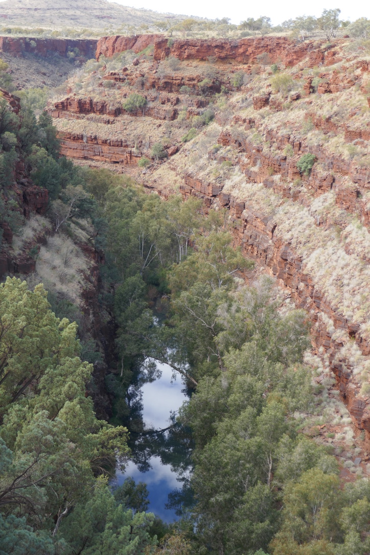 On Monday we all went off to the Dales Camp, which gave us access to the Dales Gorge and the Circular Pool and other Karijini highlights. The descent to Dales Gorge was by way of a steel stairway. I declined this as my knees would probably be okay coming up, but certainly not for the descent. I was actually quite glad to have the opportunity for a couple of hours of solitude, walking along the cliff edge and surveying the grandeur from the top. It really was very beautiful, but in some ways a bit disappointing as, being a bit later in the day, it was a bit dark looking down. The light on the cliffs would have been truly magnificent.